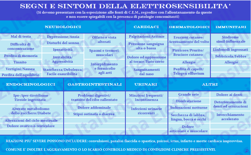 *I Segni e Sintomi riportati nella tabella sono quelli maggiormente riscontrati fra gli Elettrosensibili e trovano supporto a livello scientifico in un rapporto di ricerca stilato nel 1972 dal Dr. Zorach Glaser (PhD della Marina degli Stati Uniti), che copre più di 2.200 studi nei quali si collegano i segnali wireless deboli (radiazione a microonde) a più di 122 effetti biologici